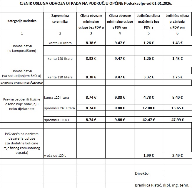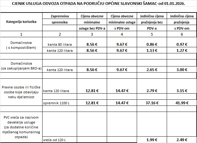 Obavještavamo Vas da je na temelju Odluke o izmjeni Odluke o načinu pružanja javne usluge sakupljanja komunalnog otpada došlo do promijene cijene obvezne minimalne javne usluge za korisnika kategorije kućanstvo i za korisnika kategorije koji nije kućanstvo. Na temelju Odluke o izmjenama i dopunama Odluke od 01.01.2026. god. na snagu će stupiti novi cjenik usluga.